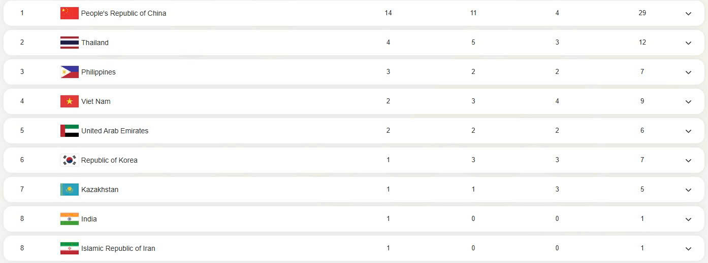Tính đến 12 giờ ngày 27-4, Đoàn thể thao Việt Nam tạm xếp thứ tư toàn đoàn, với 2 huy chương vàng, 3 huy chương bạc, 4 huy chương đồng.