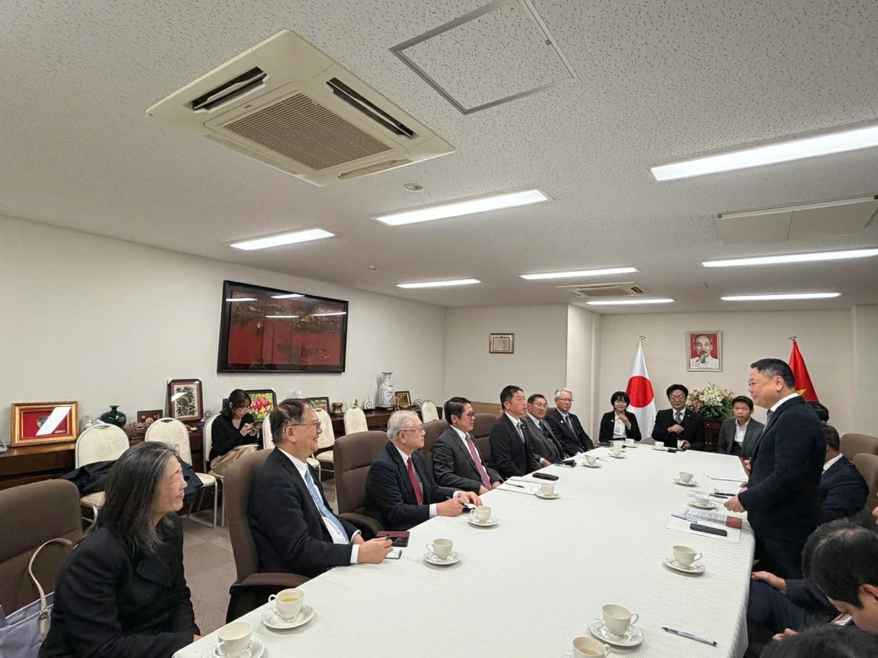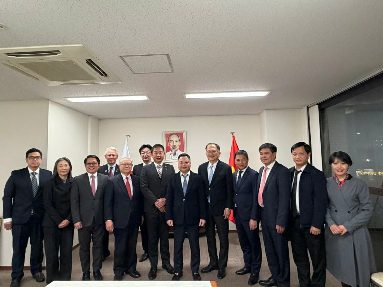 Tổng lãnh sự Ngô Trịnh Hà, đoàn Ủy ban Kinh tế - Tài chính Quốc hội Việt Nam và đại diện lãnh đạo các tổ chức hữu nghị Nhật-Việt khu vực Kansai chụp hình lưu niệm.