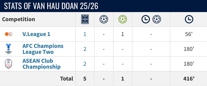 Theo thống kê của Saostar, Văn Hậu đã ra sân 5 trận cho CLB CAHN ở nhiều đấu trường khác nhau gồm giải các CLB Đông Nam Á, AFC Champions League Two và V.League. Đoàn Văn Hậu thi đấu tổng cộng 416 phút, trong đó có 4 trận đá trọn vẹn 90 phút và đóng góp 1 kiến tạo. Với một cầu thủ từng nghỉ dài hạn vì chấn thương, con số ấy mang nhiều ý nghĩa hơn những gì thể hiện trên bảng thống kê.