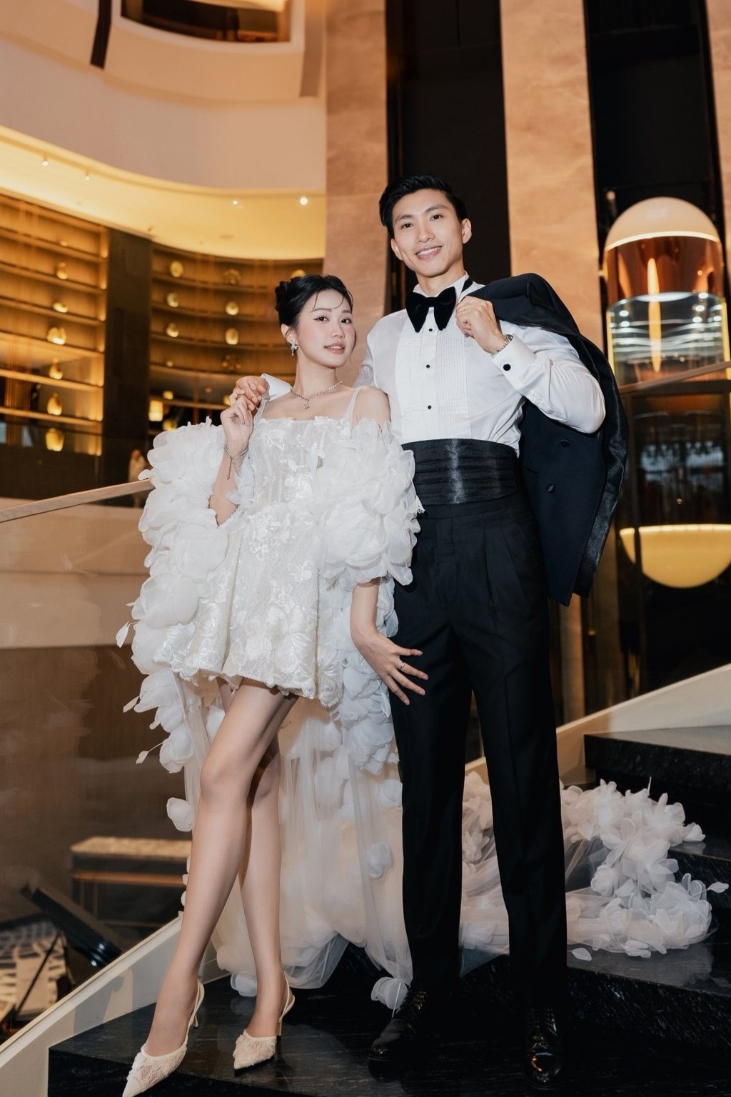 Vợ chồng Văn Hậu cùng con trai hơn 1 tuổi, biệt danh bé Lúa, xuất hiện trong khung hình lộng lẫy tại khách sạn hạng sang ở Hà Nội. Không gian được trang hoàng ấm cúng. Nam hậu vệ mặc vest bảnh bao, trong khi Doãn Hải My diện chiếc váy ren trắng tôn lên vóc dáng gợi cảm.