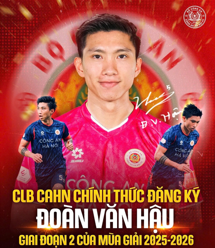 CLB Công an Hà Nội (CAHN) đã chính thức thông báo việc đăng ký hậu vệ Đoàn Văn Hậu cho giai đoạn hai V.League 2025/2026. Đây được xem là sự bổ sung quan trọng trong bối cảnh đội bóng bước vào chặng nước rút của mùa giải và chuẩn bị cho các đấu trường quốc tế.