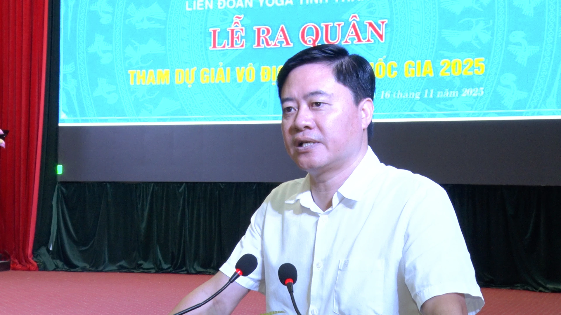 Phó Giám đốc Sở Văn hóa, Thể thao và Du lịch Nguyễn Duy Tự phát biểu động viên tinh thần các HLV và VĐV Yoga Thanh Hóa.