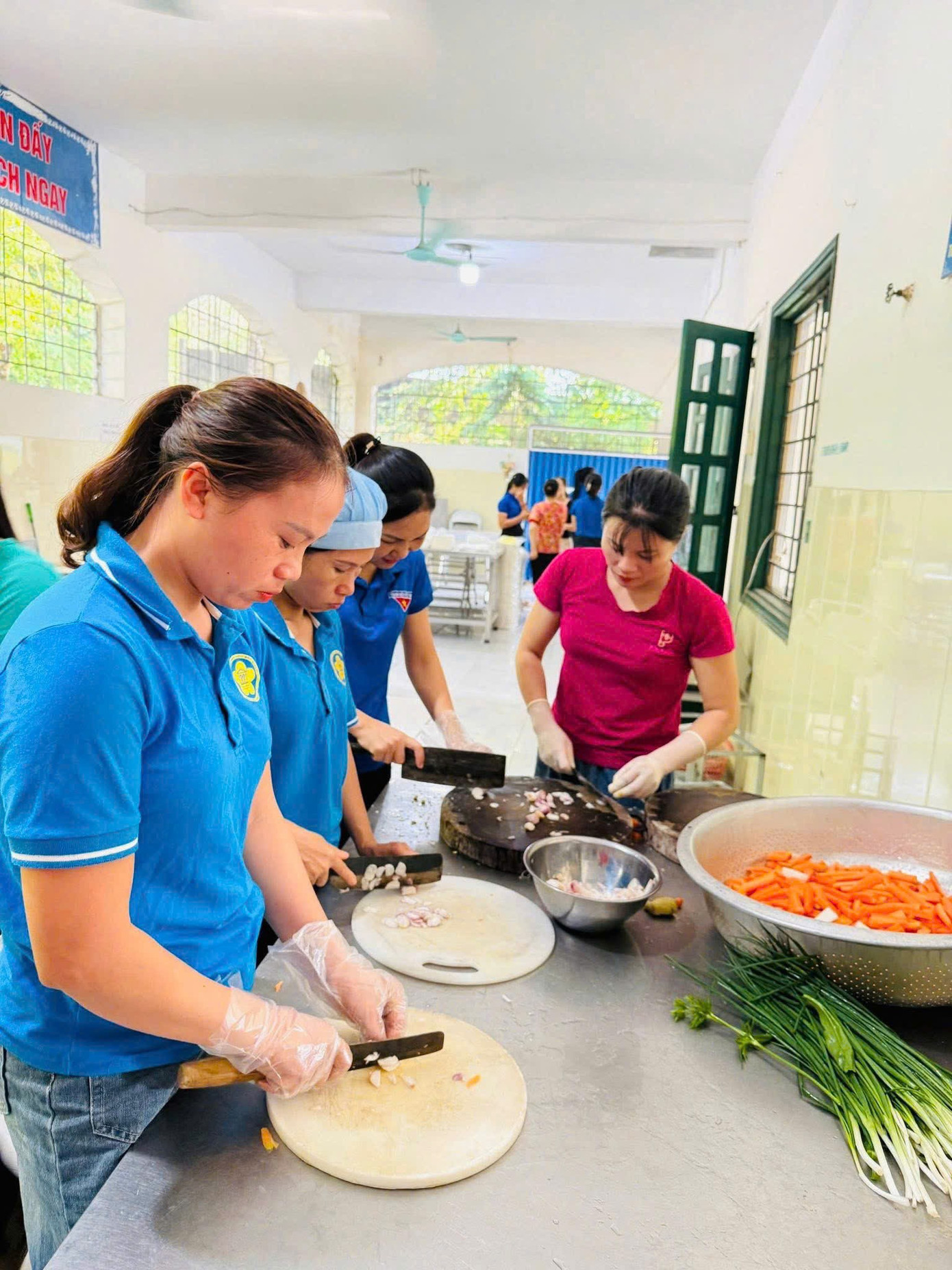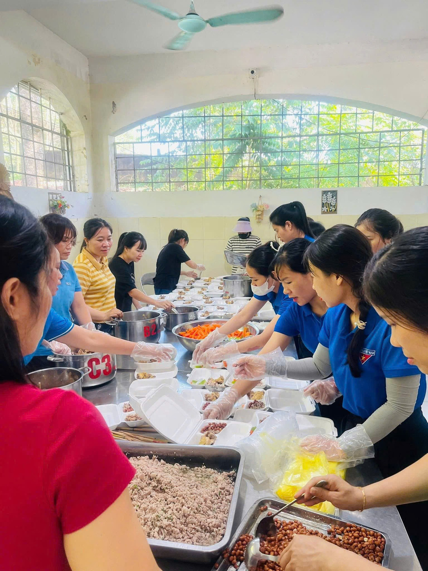 Lực lượng tình nguyện viên hỗ trợ bữa ăn cho người dân vùng lũ.