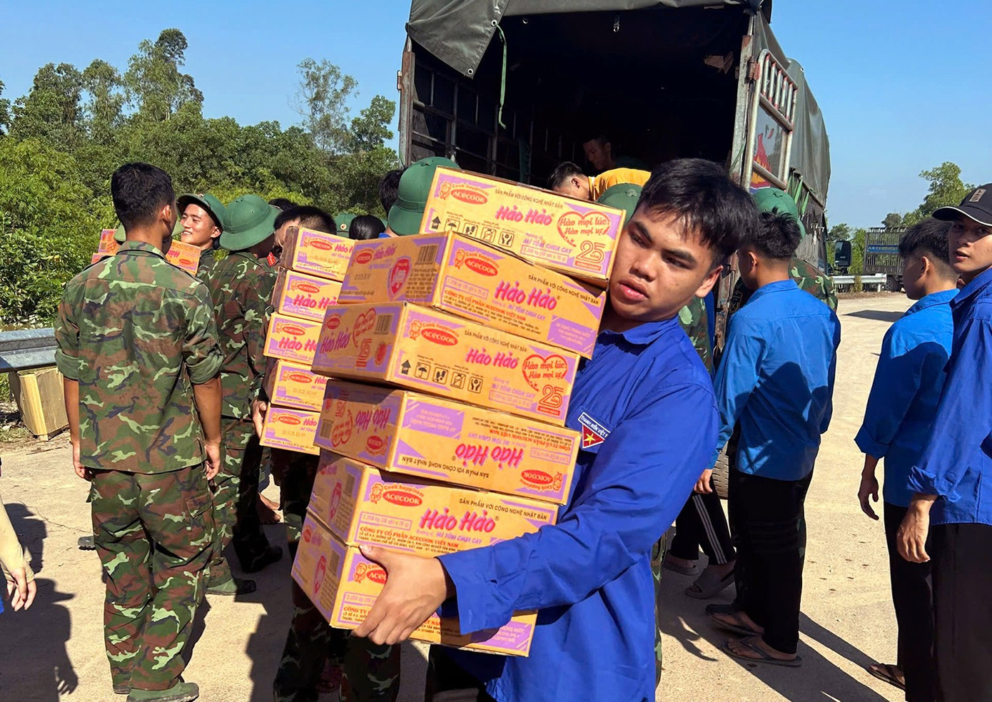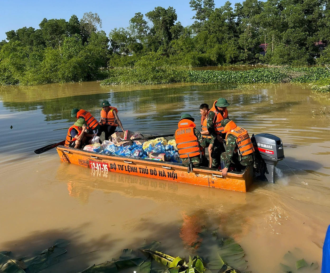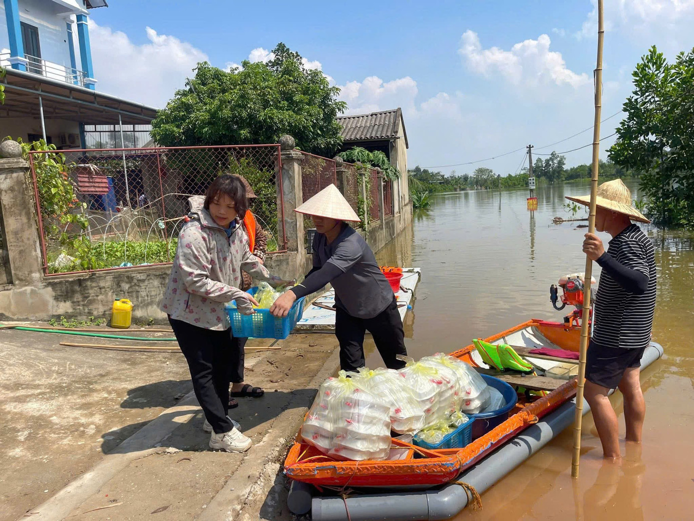 Ở thôn Đô Tân – nơi nước ngập sâu tới 3 - 4m, đoàn viên thanh niên phối hợp cùng đội cứu hộ 116 điều khiển 5 thuyền liên tục vào khu vực bị cô lập, chuyển 50 thùng nước sạch và hơn 2.000 suất nhu yếu phẩm.