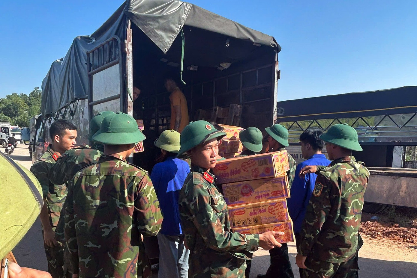 Trên mỗi con thuyền nhỏ, lực lượng quân đội căng mình vận chuyển từng thùng mì, nước uống, cơm hộp, gạo và áo phao đến vùng ngập lụt.