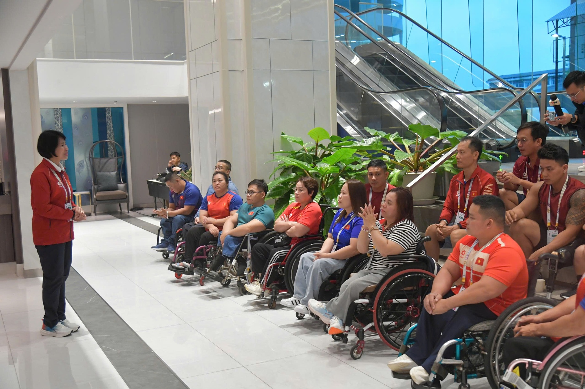 Bà Lê Thị Hoàng Yến, Trưởng đoàn TTNKT Việt Nam tham dự ASEAN Para Games 13 động viên các huấn luyện viên, vận động viên. Ảnh: THÁI DƯƠNG