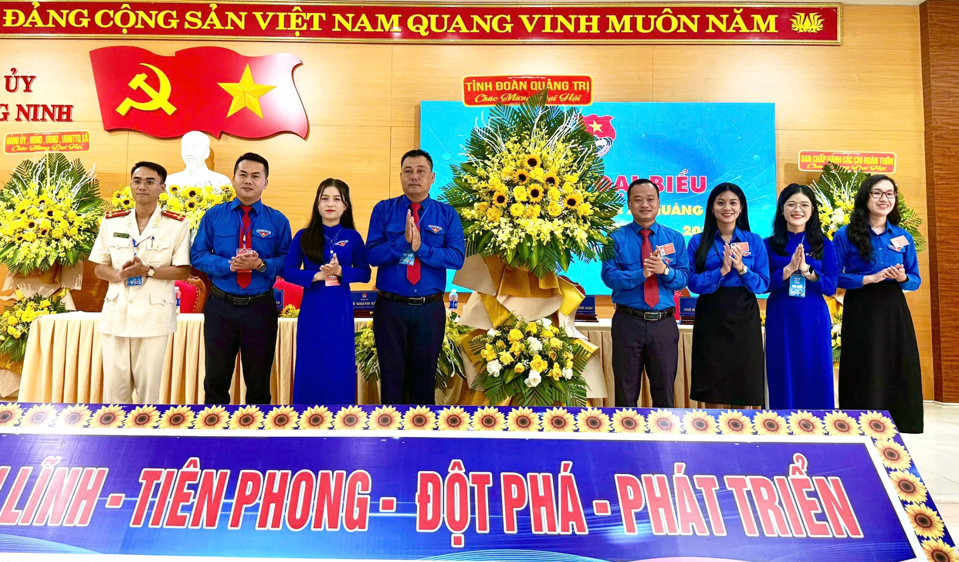 Đại diện lãnh đạo Tỉnh đoàn Quảng Trị và xã Quảng Ninh tặng hoa chúc mừng Ban Chấp hành Đoàn xã Quảng Ninh khóa I, nhiệm kỳ 2025-2030 - Ảnh: L.C