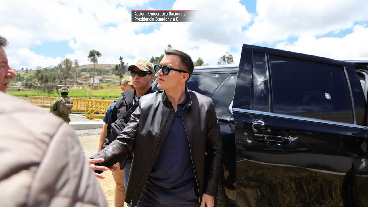 Tổng thống Ecuador Daniel Noboa đứng cạnh chiếc xe bị tấn công. (Ảnh chụp màn hình)