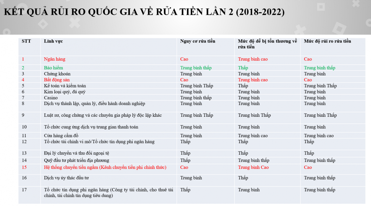 Trong khi đó, Phó Cục trưởng, Cục Phòng, chống rửa tiền nhấn mạnh, nguy cơ rửa tiền của lĩnh vực bảo hiểm được đánh giá ở mức trung bình thấp. Đáng chú ý, trong giai đoạn 2018 - 2022 không ghi nhận vụ việc xét xử rửa tiền nào liên quan đến lĩnh vực này.