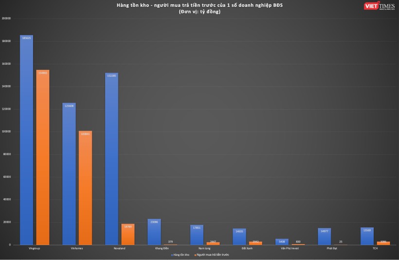 Theo thống kê của VietTimes, giá trị hàng tồn kho của nhiều doanh nghiệp bất động sản nêu trên có mức tăng trưởng mạnh trong 9 tháng năm 2025. Trong đó, tăng mạnh nhất là: Dịch vụ Hoàng Huy (tăng 40 lần), Vinhomes (gấp 2,3 lần), Văn Phú Invest (tăng 83%), Vingroup (tăng 63%), EverLand (tăng 61%), BGI Group (tăng 57%), Tài chính Hoàng Huy (tăng 10%).