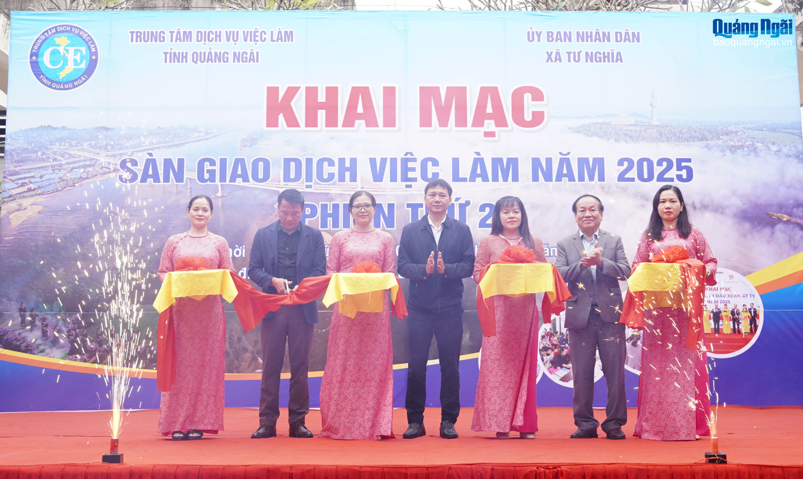 Các đại biểu thực hiện nghi thức cắt băng khai mạc sàn giao dịch việc làm tại xã Tư Nghĩa.