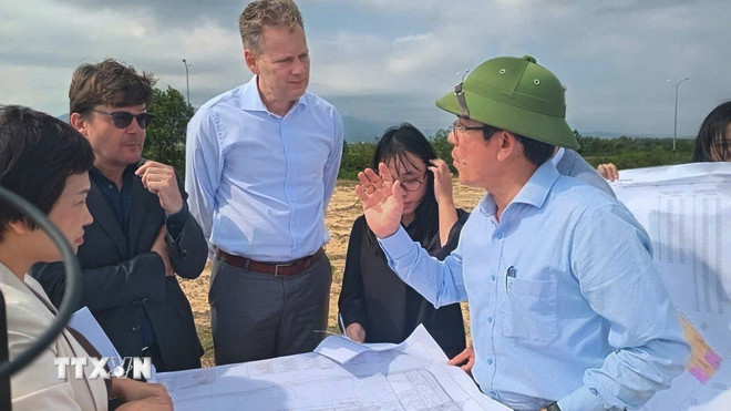 Phó Chủ tịch UBND thành phố Đà Nẵng Trần Nam Hưng (ngoài cùng bên phải) giới thiệu về tiềm năng và định hướng phát triển của Khu kinh tế mở Chu Lai. (Ảnh: Đoàn Hữu Trung/TTXVN)