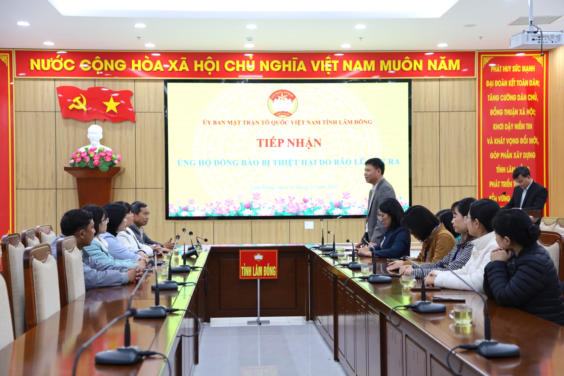 Thay mặt Ủy ban MTTQ Việt Nam tỉnh Lâm Đồng, ông Ngô Văn Sơn, Phó trưởng Ban Tuyên giáo và Công tác xã hội, Ủy ban MTTQ Việt Nam tỉnh bày tỏ sự trân trọng và cảm ơn sâu sắc tình cảm quý báu, nghĩa cử cao đẹp của Hiệp hội Doanh nghiệp tỉnh Lâm Đồng đã chung tay ủng hộ, hướng về đồng bào vùng thiên tai.