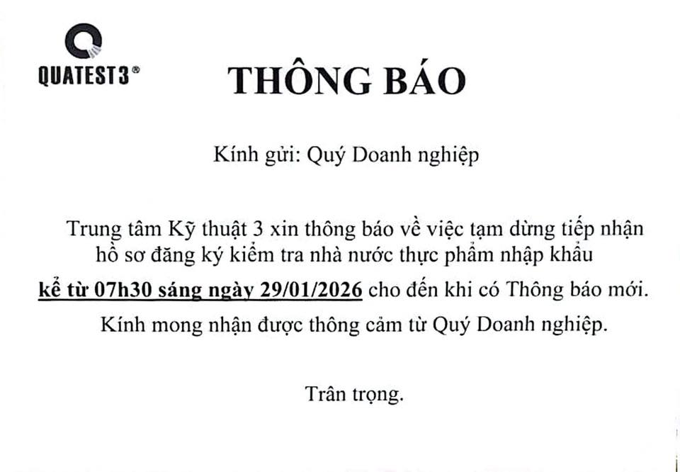 Theo tài khoản Ngô Kim Thi, các cơ quan kiểm định chất lượng hàng hóa như Trung tâm kỹ thuật 3 (Quatest 3) đều ra thông báo tạm dừng tiếp nhận hồ sơ đăng ký kiểm tra Nhà nước thực phẩm nhập khẩu. Việc tạm ngừng tiếp nhận này được thực hiện từ ngày 29/1/2026 cho đến khi có thông báo mới.