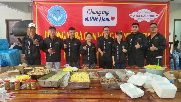 Nhóm ATM Gạo Huế thiết lập bếp ăn dã chiến, cung cấp 3.000 suất cơm nóng mỗi ngày cho đồng bào vùng lũ.