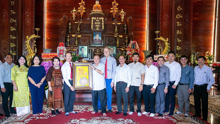 Đại diện đoàn trân trọng trao tặng đại diện gia đình cố Thủ tướng Phan Văn Khải bức tranh thư pháp với chữ “Kiến quốc”.