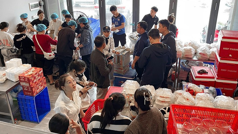 Hội viên Hội Doanh nhân trẻ Việt Nam chuẩn bị các suất cơm và nhu yếu phẩm gửi về vùng lũ.