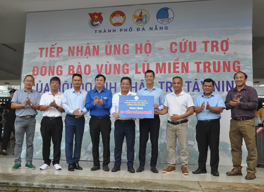 Ngày 5/11, Hội doanh nhân trẻ thành phố Đà Nẵng đã tiếp nhận 20 tấn hàng hóa gồm các nhu yếu phẩm do Hội Doanh nhân trẻ Tây Ninh gửi tặng, hỗ trợ người dân vùng lũ.