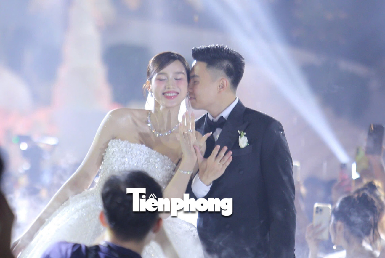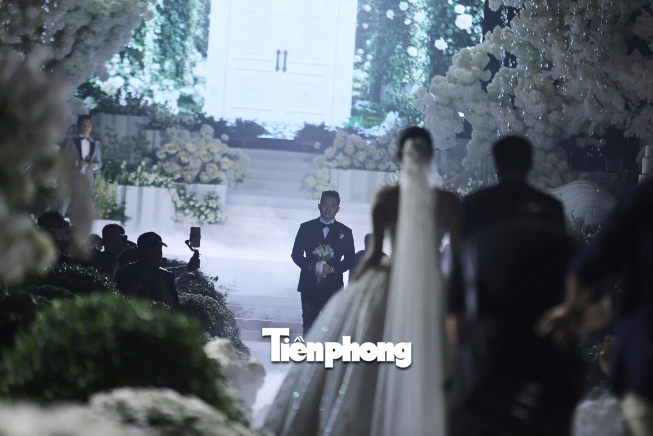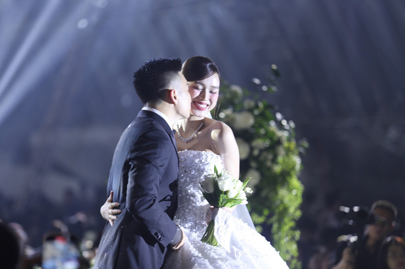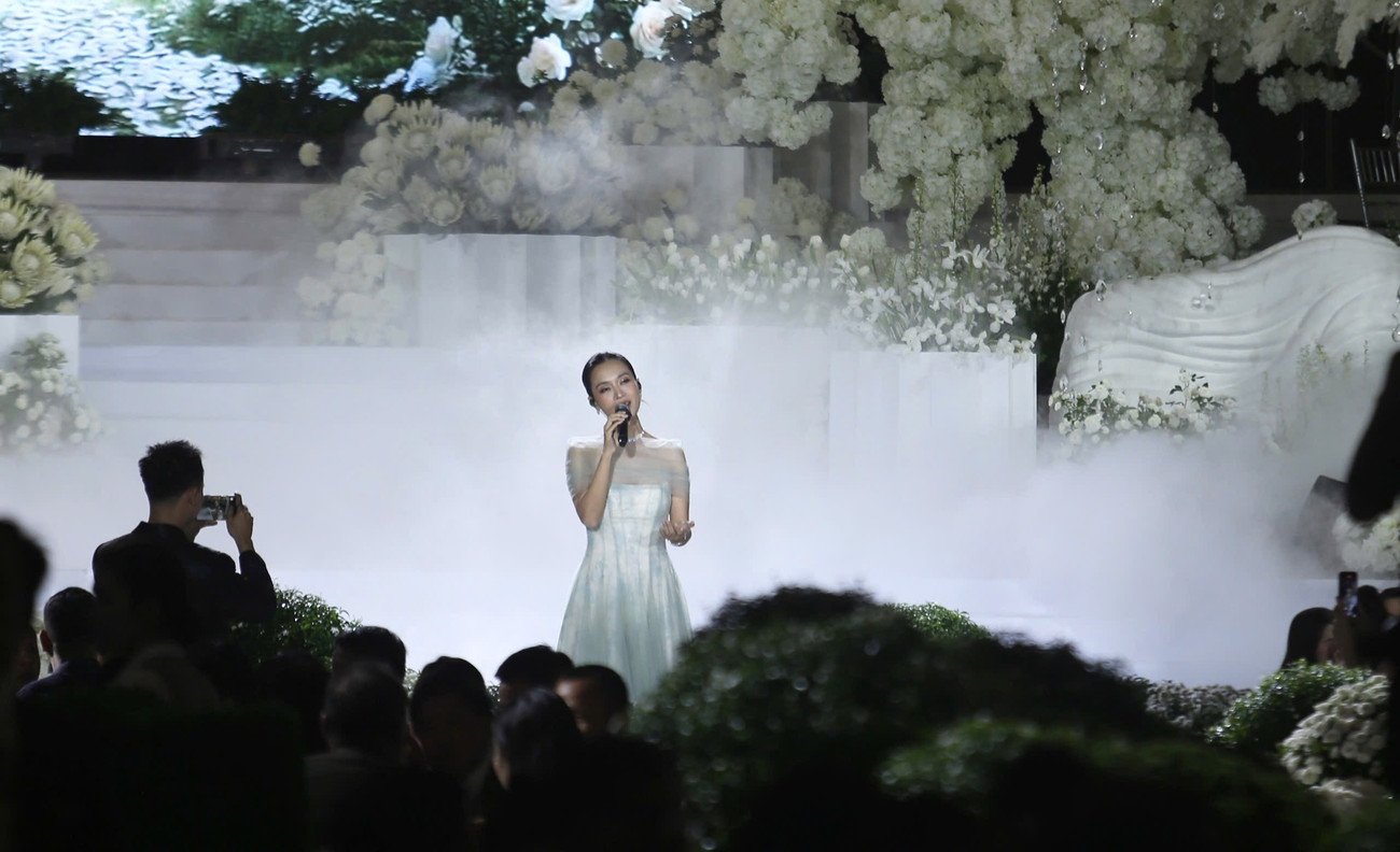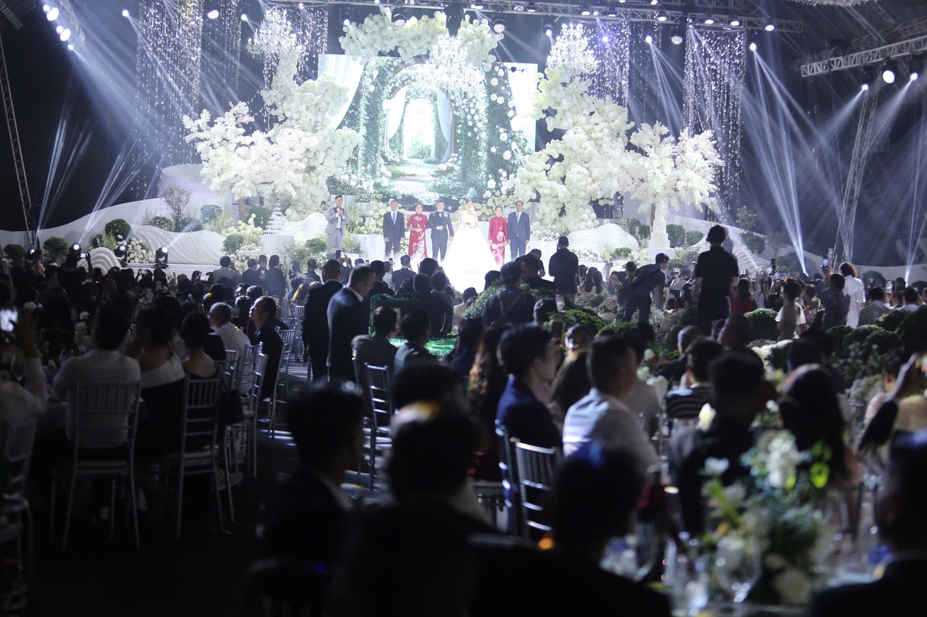 Hoa hậu Việt Nam 2020 rưng rưng xúc động trong khoảnh khắc thiêng liêng của ngày trọng đại. Trên sân khấu, cô dâu và chú rể thực hiện những nghi thức truyền thống như ra mắt quan viên hai họ, trao nhẫn cưới, rót rượu…