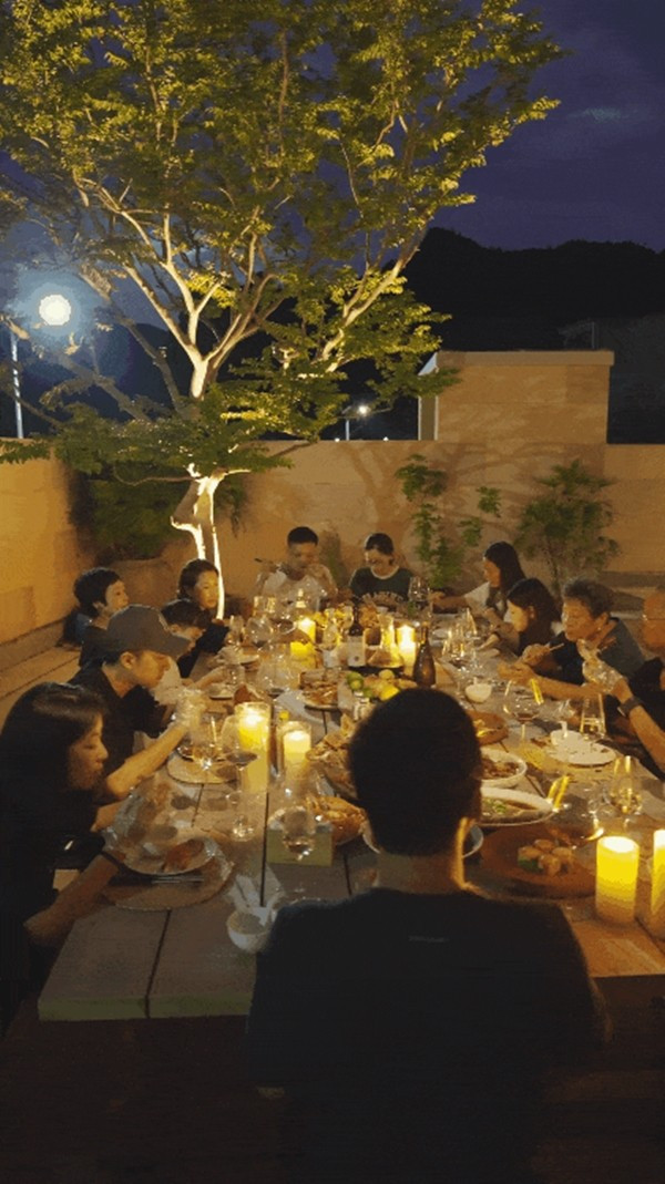 Ngôi nhà gồm 4 tầng, một ao cá và một khoảng sân nhỏ. Cả gia đình cùng nhau nướng thịt ở sân trong khi bố ông Cung đọc sách, những đứa trẻ nô đùa bên ao cá. Ảnh: Sohu
