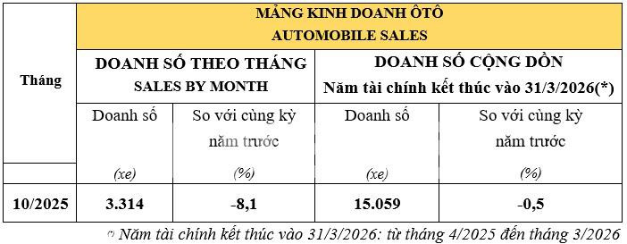 Theo báo cáo từ nhà sản xuất xe Nhật Bản tại Việt Nam, mảng kinh doanh ôtô của Honda Việt Nam ghi nhận giảm nhẹ. Cụ thể, trong tháng 10/2025, hãng chỉ bán được 3.314 xe, giảm 8,1% so với cùng kỳ năm ngoái. Lũy kế từ đầu năm tài chính 2025–2026, doanh số đạt 15.059 xe, thấp hơn 0,5% so với cùng kỳ.