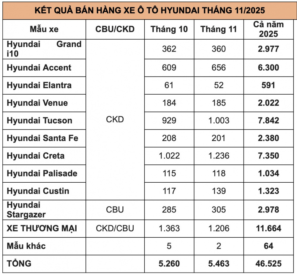 Trong nhóm xe du lịch, Hyundai Creta tiếp tục giữ phong độ ấn tượng khi trở thành mẫu xe bán chạy nhất tháng với 1.236 xe giao đến khách hàng, tăng mạnh 20,9% so với tháng 10. Hyundai Tucson theo sát ở vị trí thứ hai với 1.003 xe, tăng trưởng 7,9%, tiếp tục củng cố sức hút của dòng SUV hạng C. Đứng thứ ba là Hyundai Accent, đạt 656 xe và tăng 7,7% so với tháng trước, cho thấy phân khúc sedan hạng B vẫn duy trì sức cạnh tranh ổn định.