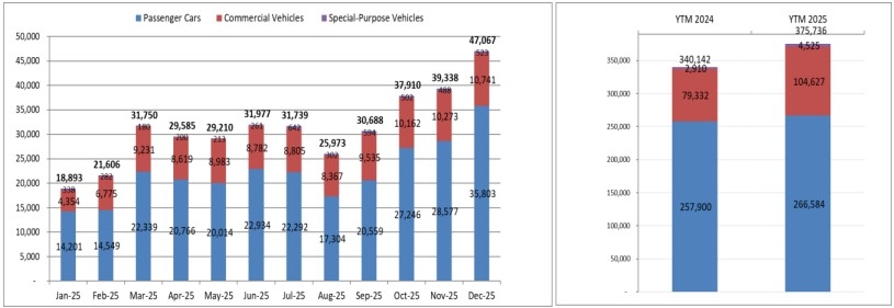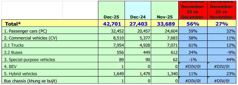 Theo báo cáo bán hàng của Hiệp hội Các nhà sản xuất Ô tô Việt Nam (VAMA), doanh số bán hàng của toàn thị trường đã đạt 47.067 xe trong tháng 12 vừa qua, tăng 20% so với tháng 11/2025 và tăng 49% so với cùng kỳ năm ngoái.