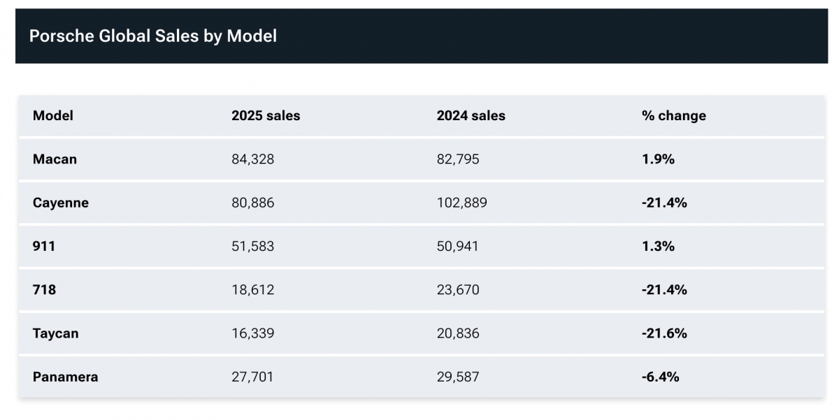 Doanh số chi tiết các dòng xe Porsche năm 2025 và 2024. (Đơn vị: Xe)