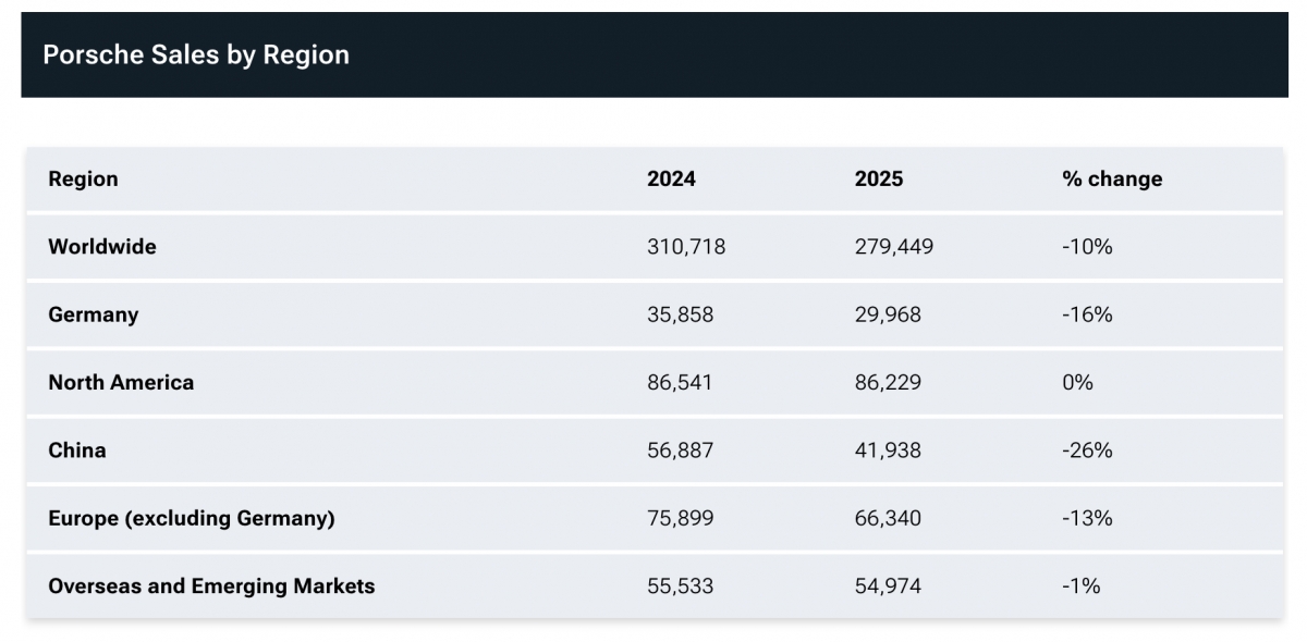 Điều đáng lo ngại hơn đối với Porsche là doanh số bán hàng giảm ở mọi khu vực trên thế giới ngoại trừ Bắc Mỹ, nơi doanh số vẫn giữ nguyên. Châu Âu giảm, Đức giảm, các thị trường nước ngoài giảm. Trung Quốc tiếp tục là thị trường gây thất vọng lớn nhất khi nhu cầu xe sang giảm mạnh. Doanh số bán hàng tại Trung Quốc đã giảm mạnh 26% trong năm 2025 sau khi đã giảm 28% vào năm trước đó.