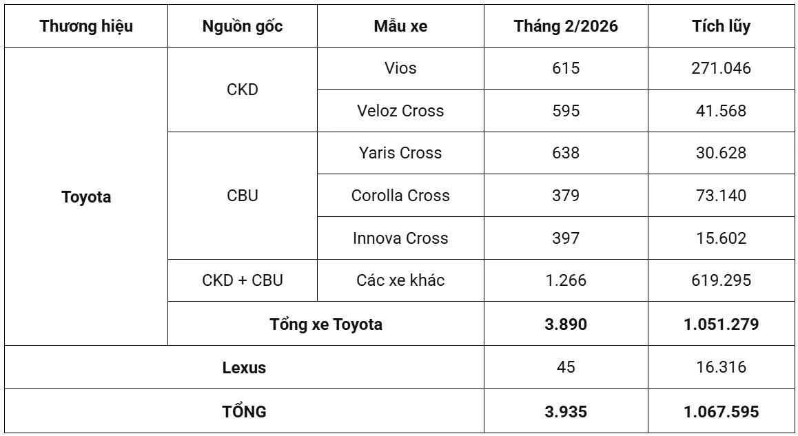 So với tháng 1/2026, tổng doanh số của Toyota Việt Nam giảm khoảng 22%, nguyên nhân chủ yếu do kỳ nghỉ Tết Nguyên đán kéo dài làm gián đoạn hoạt động mua bán. Tuy nhiên, nếu so với cùng kỳ năm 2025, kết quả tháng 2/2026 vẫn tăng trưởng 25%, cho thấy tín hiệu phục hồi tích cực của thị trường ô tô Việt Nam và sức hút bền vững của thương hiệu Toyota.