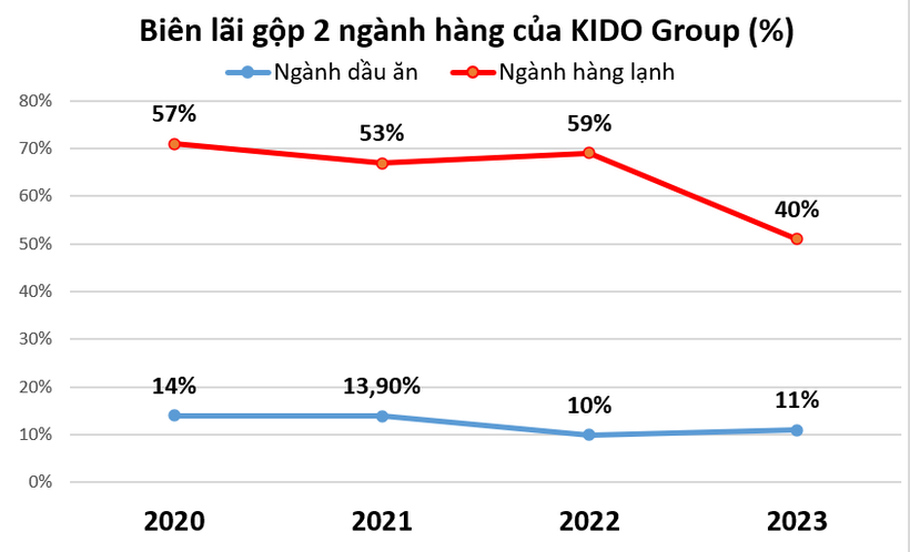 Xét giai đoạn 2020 – 2023 (số liệu 2024 không công bố chi tiết), ngành hàng lạnh đem về chỉ 14 - 16% tổng doanh thu của KIDO Group nhưng đóng góp tới 40 - 60% biên lợi nhuận gộp. Trong khi đó, dầu ăn – lĩnh vực đóng góp hơn 80% doanh thu thuần cho tập đoàn mẹ – lại chỉ mang lại biên lợi nhuận gộp loanh quanh mức 10%.