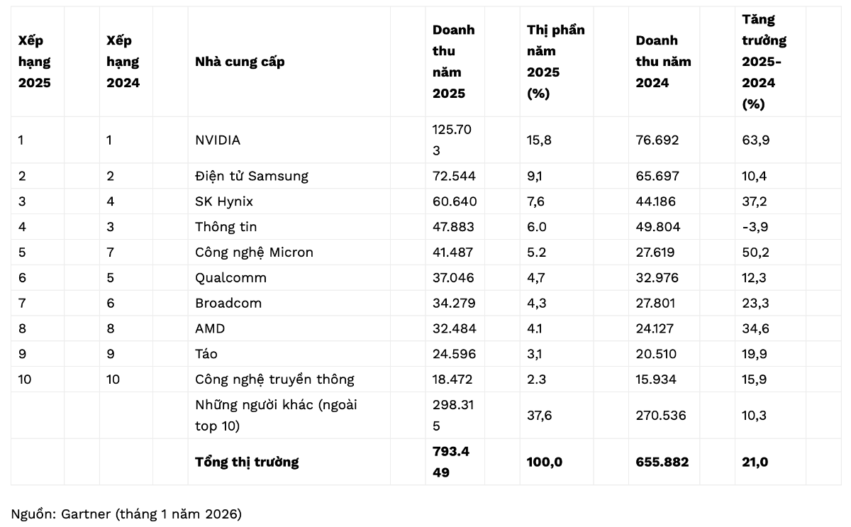 Trong khi đó, theo số liệu sơ bộ của Gartner, doanh thu ngành bán dẫn toàn cầu năm 2025 đạt khoảng 793 tỷ USD, tăng 21% so với năm trước.