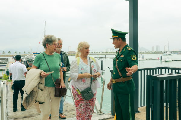 Bộ đội biên phỏng Khánh Hòa hướng dẫn du khách nước ngoài từ tàu du lịch biển quốc tế Costa Serena lên bến Du thuyền quốc tế Ana Marina.