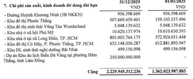 Chi phí sản xuất kinh doanh dở dang ghi nhận gần 2.230 tỷ đồng, tăng 64%, trải rộng tại các dự án khu nhà ở xã Long Điền (TPHCM) 803 tỷ đồng, khu đô thị Cỏ Mây 652 tỷ đồng, khu đô thị Phước Thắng gần 508 tỷ đồng và các dự án khác.