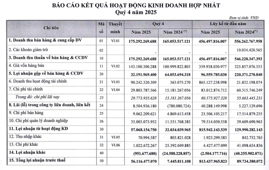 Theo báo cáo tài chính hợp nhất quý IV/2025, CTCP Phát triển Nhà Bà Rịa - Vũng Tàu (Hodeco, mã ck: HDC) ghi nhận doanh thu thuần đạt hơn 175 tỷ đồng, tăng 6% so với cùng kỳ. Giá vốn tăng cao 42% lên 143,1 tỷ đồng, lãi gộp giảm 50%, còn hơn 32 tỷ đồng.