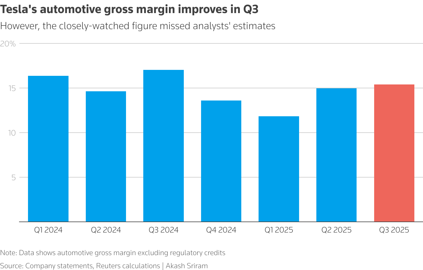 Tesla cho biết lợi nhuận trên mỗi cổ phiếu trong quý đạt 0,5 USD, thấp hơn mức dự báo 0,55 USD. Biên lợi nhuận gộp đạt 18%, cao hơn một chút so với ước tính 17,5%, nhưng biên lợi nhuận mảng ôtô (loại trừ tín chỉ khí thải) chỉ còn 15,4%, giảm so với cùng kỳ năm trước. Nguồn thu từ tín chỉ khí thải, vốn từng là động lực lớn cho lợi nhuận Tesla, đã giảm còn 417 triệu USD, so với 739 triệu USD cùng kỳ năm 2024 và 435 triệu USD quý trước.