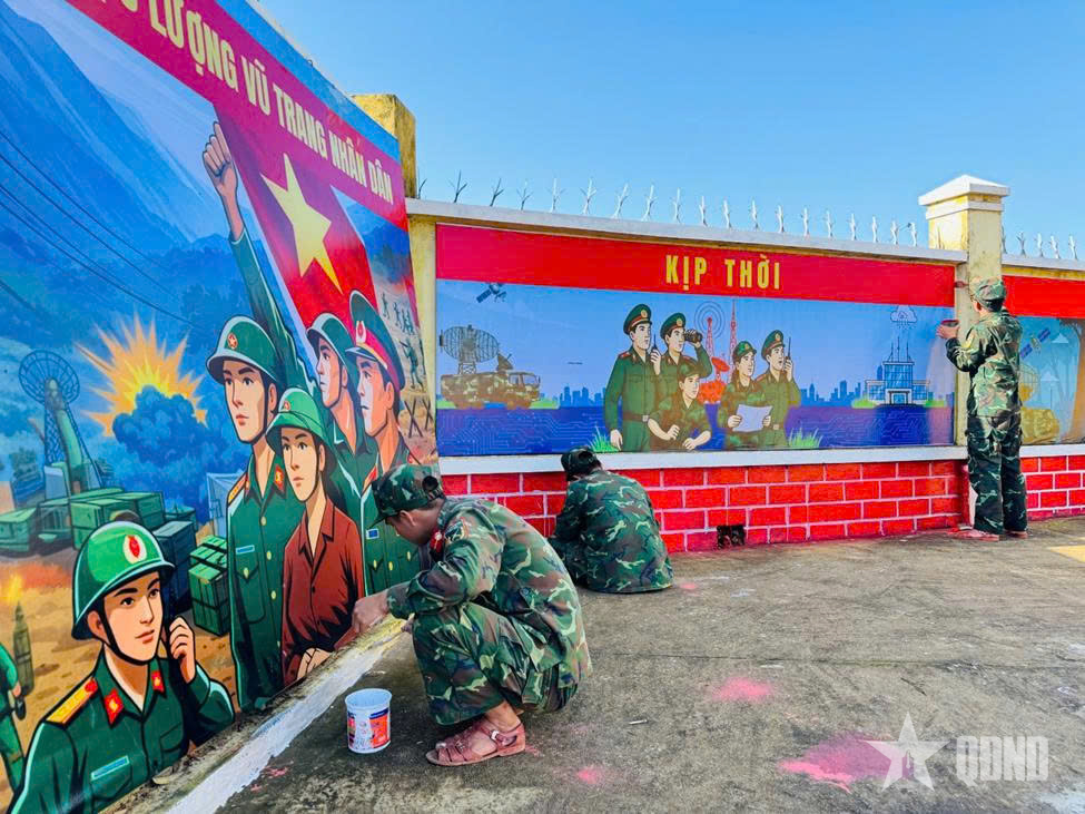Những bức tường bao được bộ đội sơn sửa, làm mới, vẽ tranh cổ động đón chào năm mới.