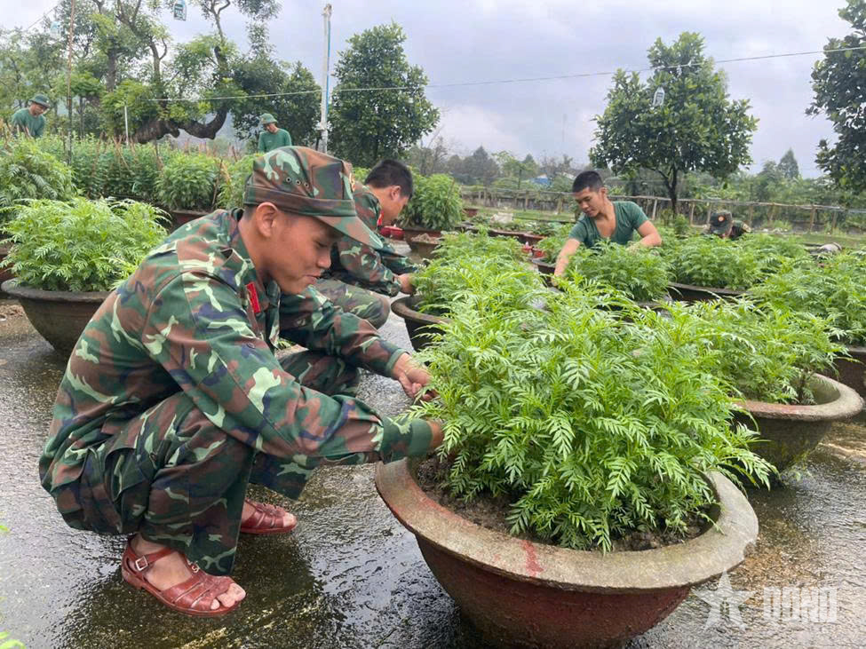 Những chậu cúc, mào gà, thược dược được bộ đội tự tay ươm trồng chuẩn bị đón Tết.