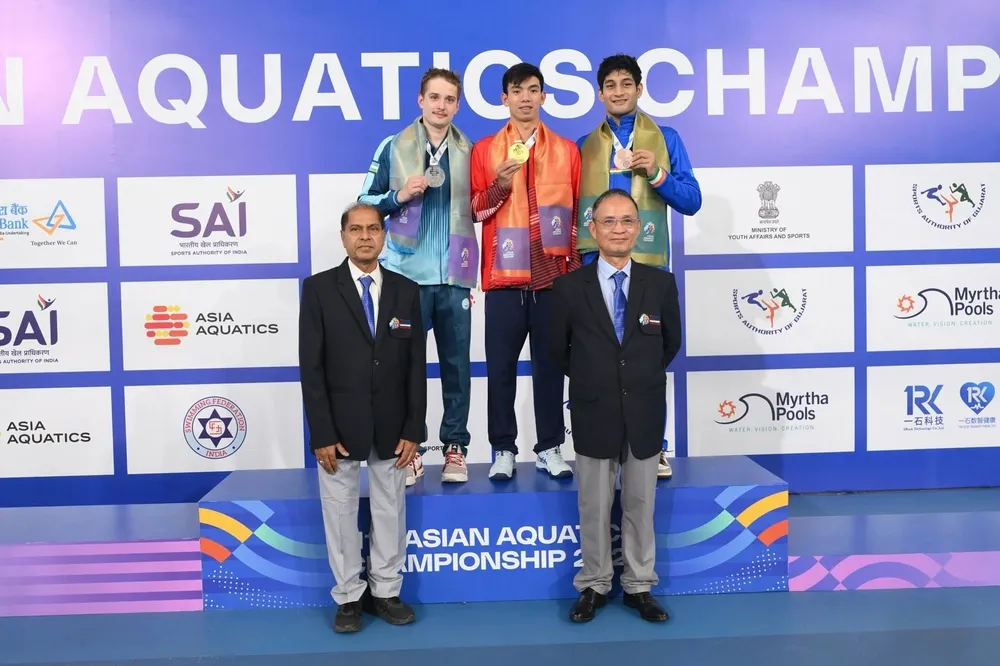 Nguyễn Huy Hoàng (đỏ) trên bục nhận HCV giải bơi vô địch châu Á. Ảnh: FBVN