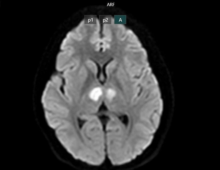 Phim chụp cho thấy não bệnh nhân bị tổn thương vùng đồi thị hai bên vì dùng thuốc giảm cân chứa chất cấm. Ảnh: BVCC.