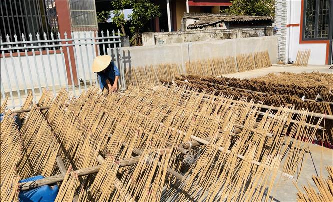 Về làng hương những ngày giáp Tết, tranh thủ thời tiết nắng đẹp, bà con đem hương ra phơi. Trên con đường làng dẫn vào thôn, tại những bãi đất trống hay sân nhà các hộ dân, hương được xếp san sát, nối dài ngay ngắn. Mùi thơm đặc trưng lan tỏa khắp mọi nẻo đường.