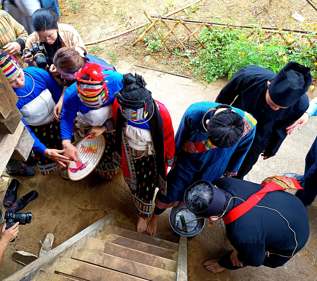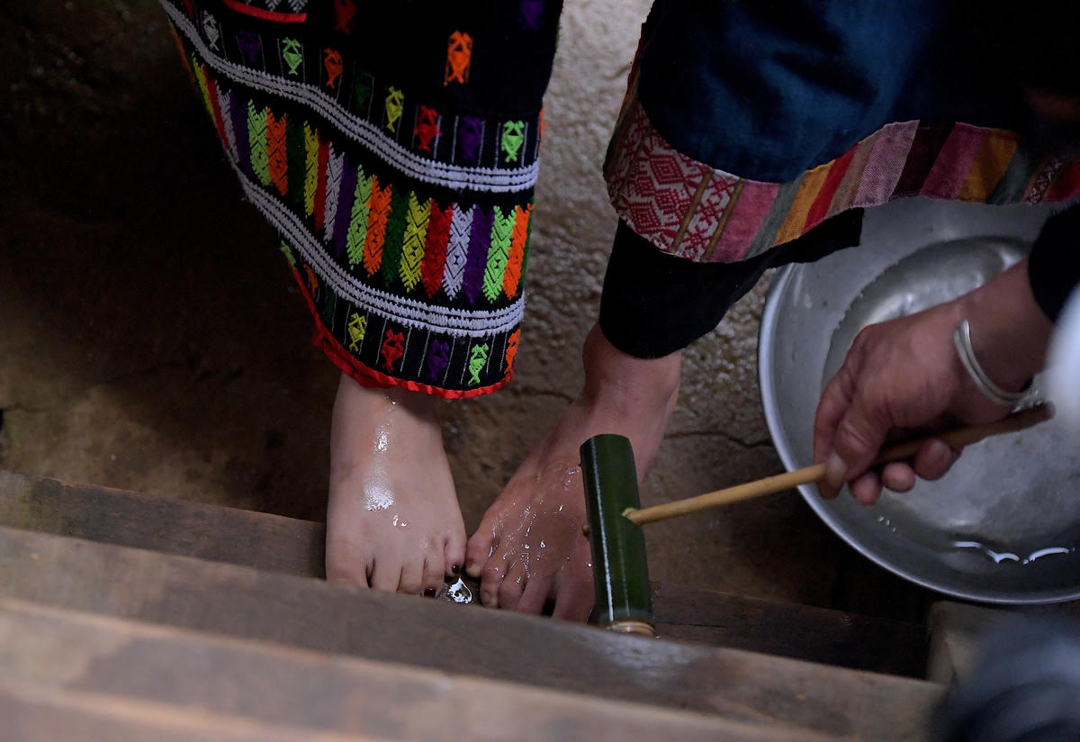 Khi bước chân lên cầu thang nhà trai, cô dâu phải bỏ nón, ông Mơ múc nước để rửa chân cho cô dâu, chú rể.