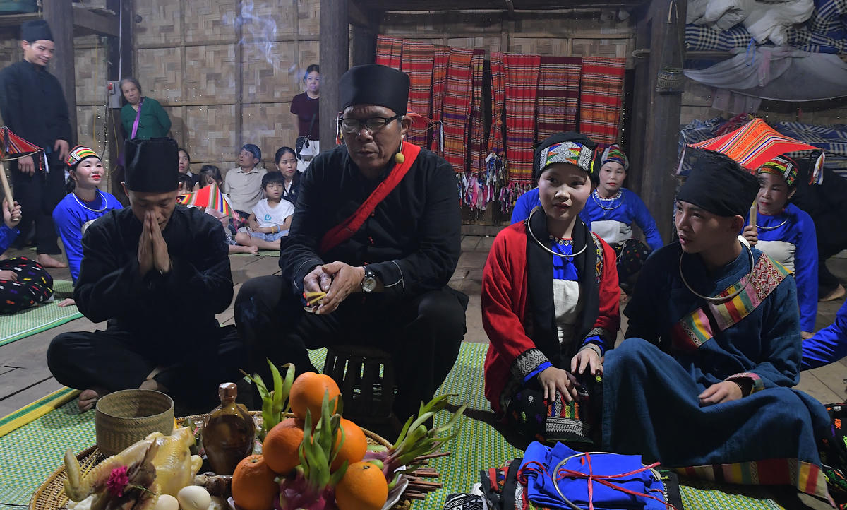 Cô dâu, chú rể thực hiện nghi thức vái lạy trước bàn thờ tổ tiên, đồng thời ông Mơ dâng mâm cúng gồm thủ lợn, rượu và bánh chưng, thưa gửi từ nay, người con gái này là con dâu chính thức của dòng họ, xin được các bậc tiền nhân phù hộ.