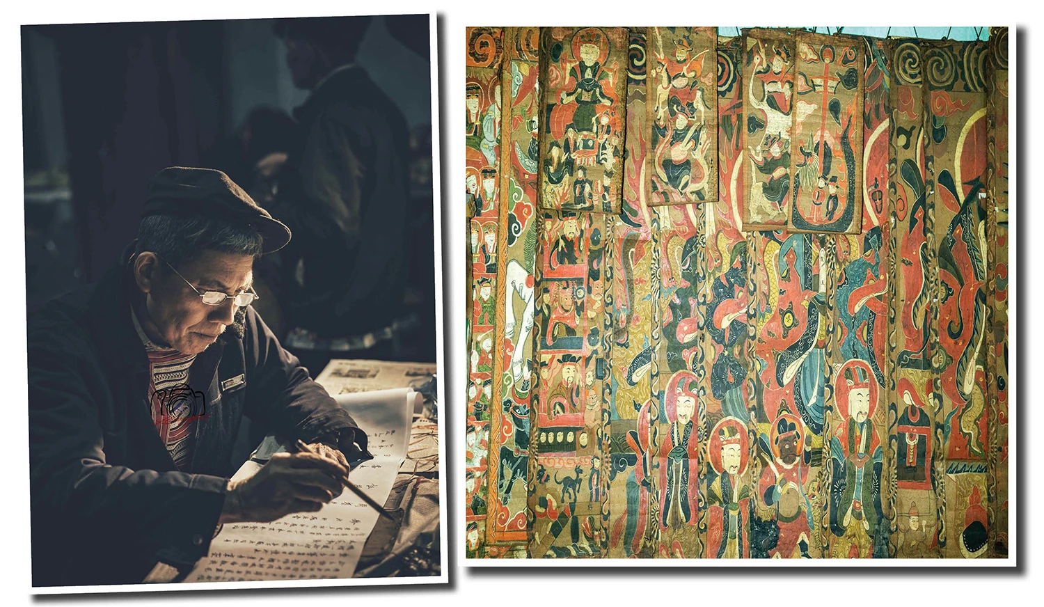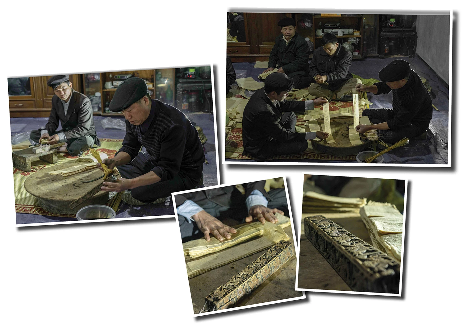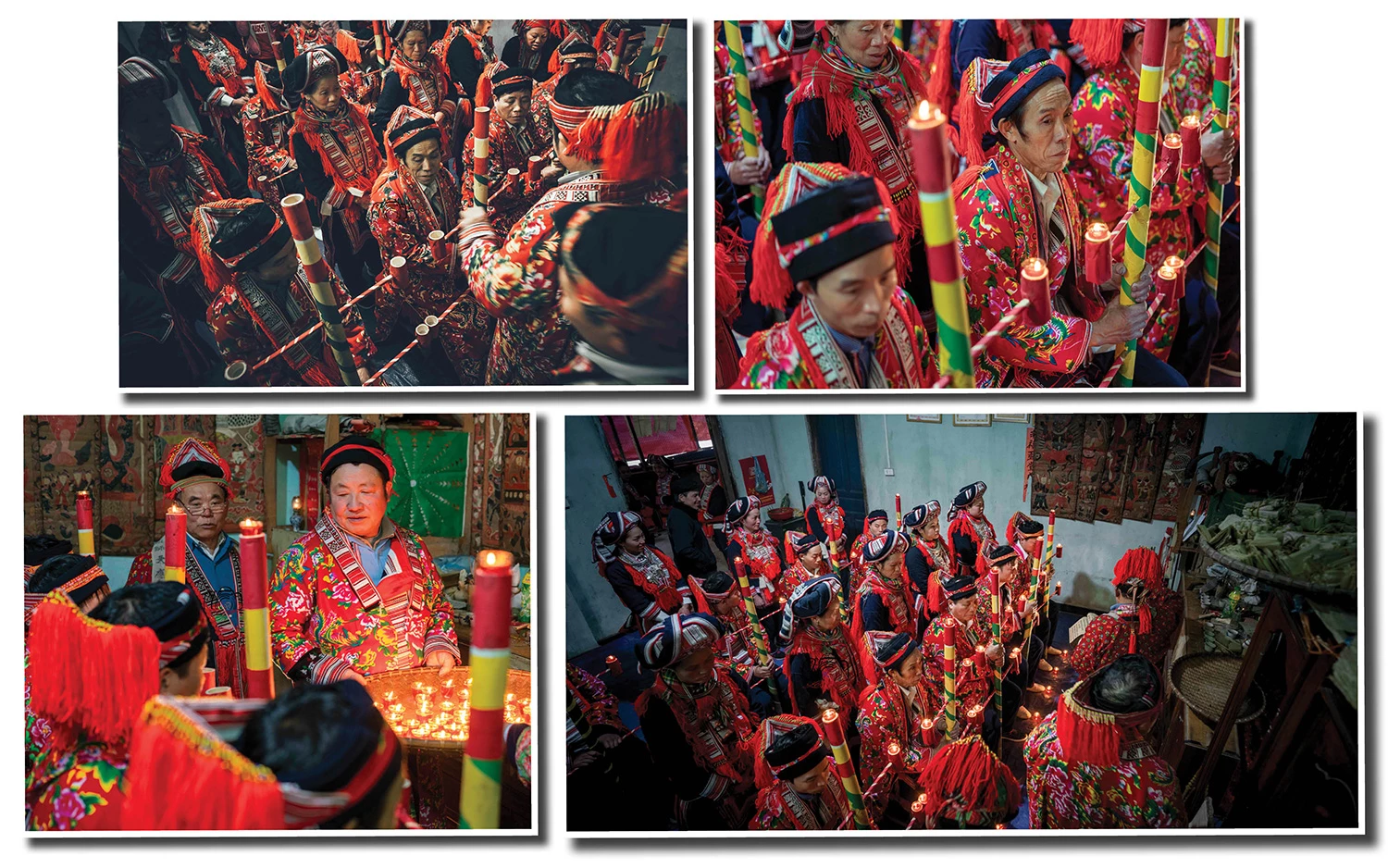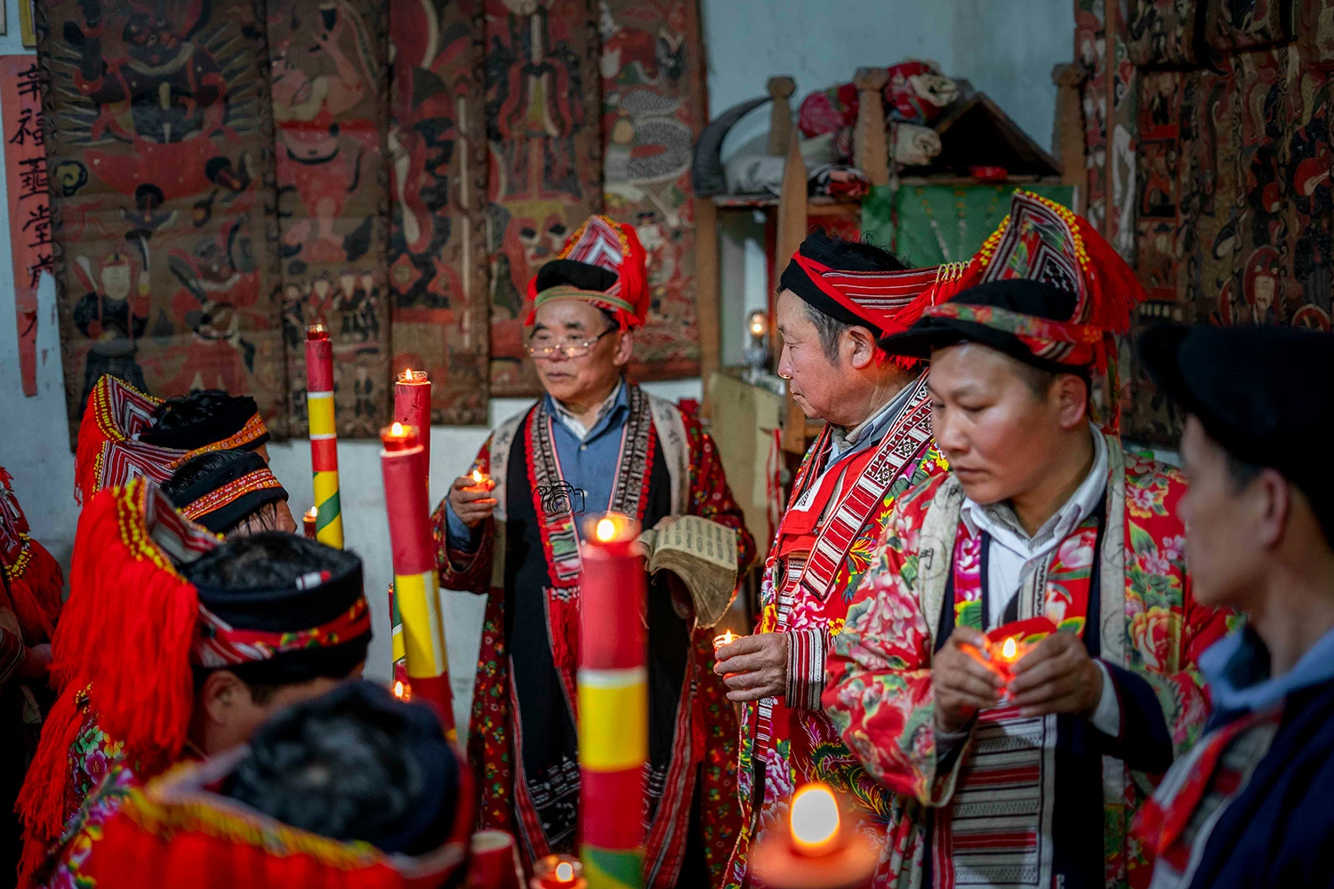 Trong sắc áo đỏ rực rỡ in hoa văn trắng, đầu đội mũ chóp nhọn tua rua, các thầy như những đốm lửa thiêng nổi bật giữa không gian nhà sàn. Ở góc trang trọng nhất, Thầy Cả Triệu Quầy Rồng đang tĩnh tâm, dồn hết thần lực vào ngọn bút lông để viết Sớ. Từng nét chữ hiện ra trên giấy bản là từng lời cầu khẩn, gửi gắm mong ước bình an lên tổ tiên.