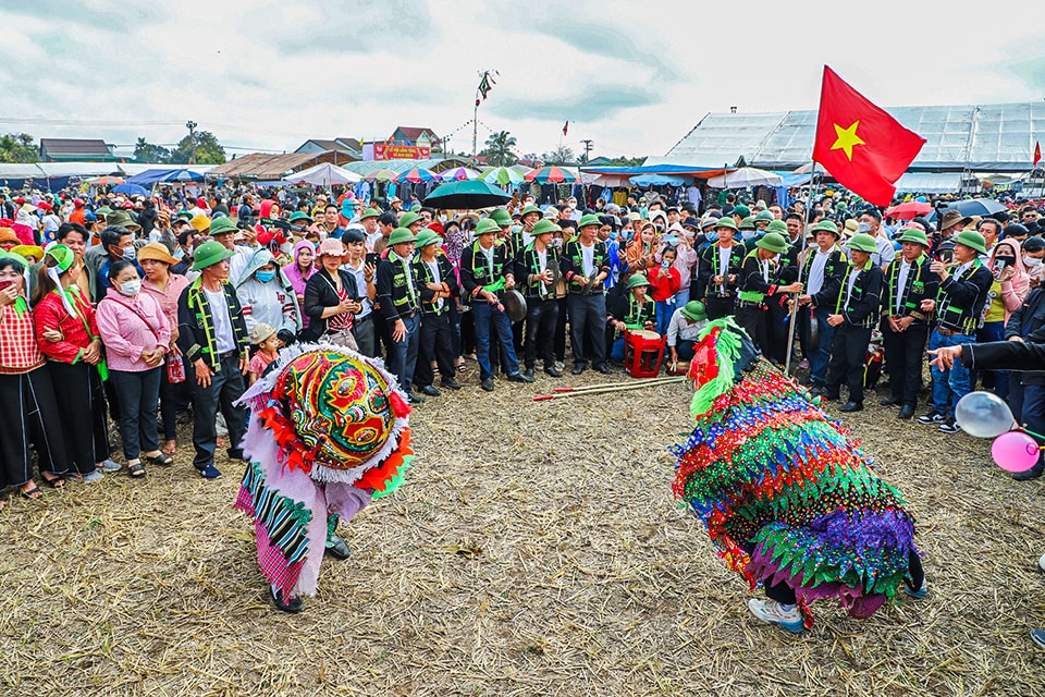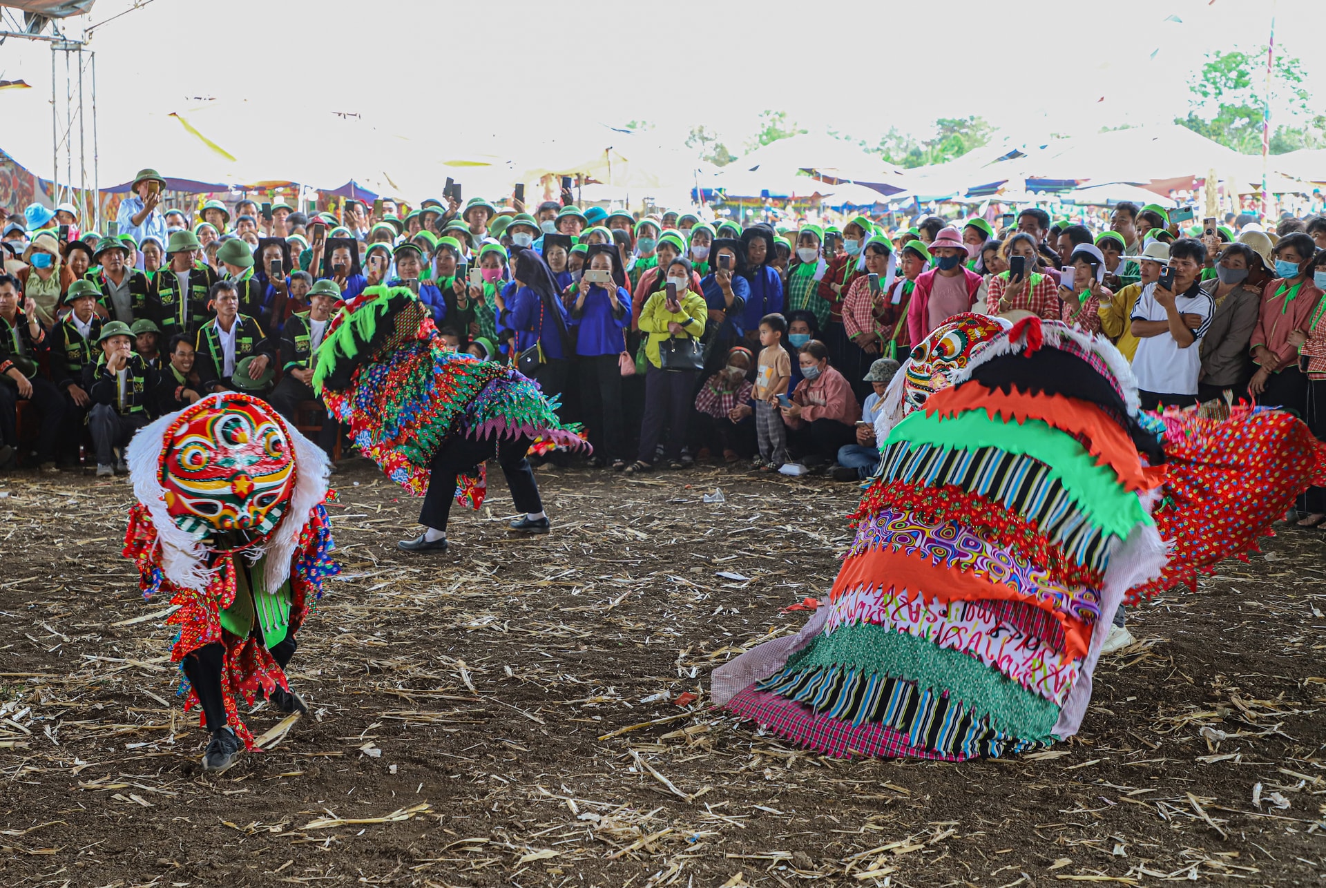 Sau phần nghi lễ cúng, đội múa sư tử mèo thay nhau biểu diễn không chỉ mang lại niềm vui ngày Tết mà còn gửi gắm khát vọng về cuộc sống ấm no, hạnh phúc trên vùng đất mới