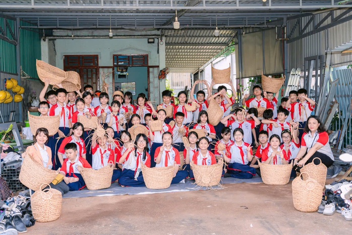 Các em học sinh Trường THCS Nguyễn Anh Ninh (phường Vũng Tàu) trải nghiệm nghề đan lục bình ở xã đảo Long Sơn.