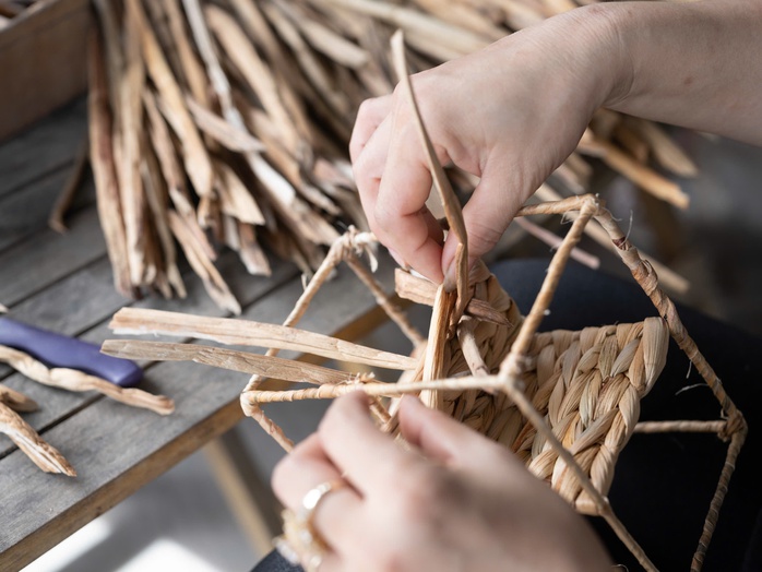 "Cây phơi đạt chuẩn là thân có màu vàng óng, dẻo dai mà vẫn đủ độ cứng. Đây là bước quan trọng quyết định đến độ bền và thẩm mỹ của sản phẩm. Kỹ thuật xử lý nguyên liệu tốt sẽ giúp quá trình đan lát thuận lợi hơn rất nhiều. Đan lục bình không khó nhưng đòi hỏi người làm phải tỉ mỉ, chịu khó" - chị Hoàng Lan cho hay.