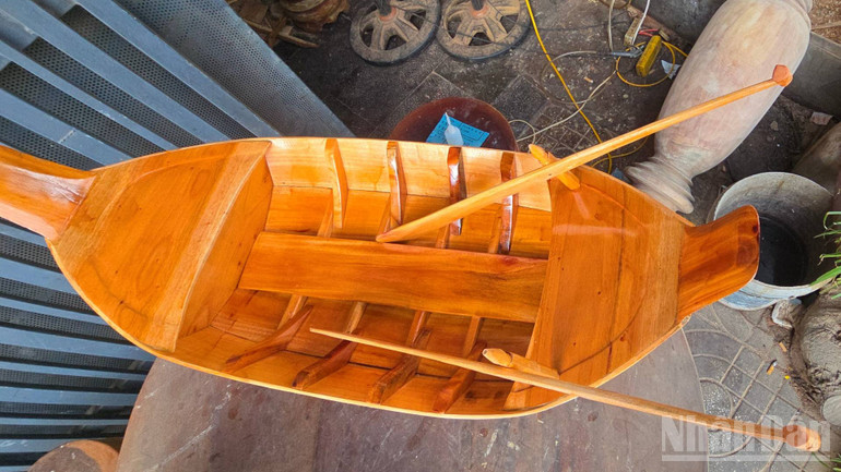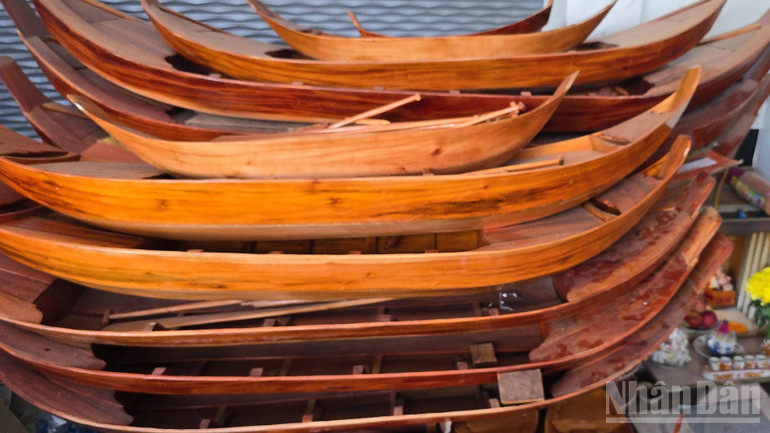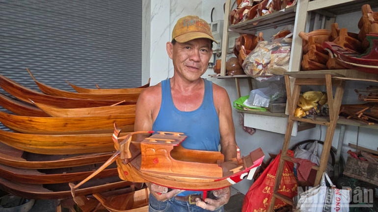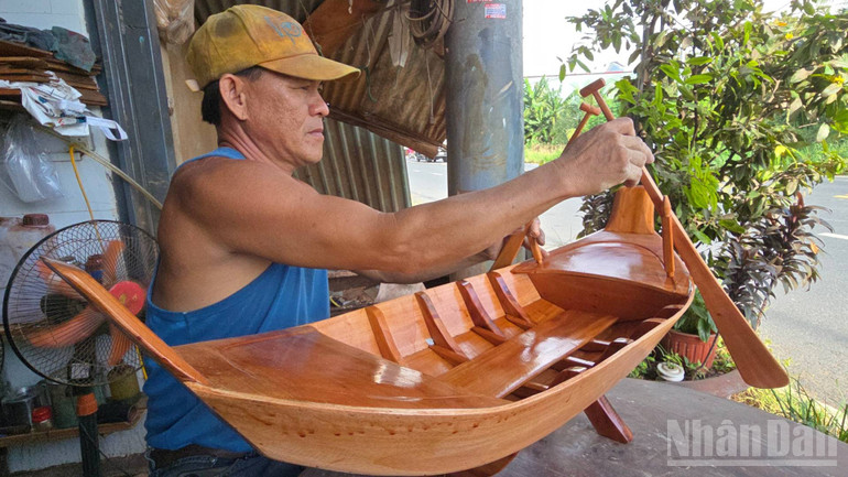 Ông Mỏng đặt tên cơ sở thủ công mỹ nghệ Chín Mỏng. Gặp chúng tôi, ông Chín Mỏng cười hóm hỉnh, gọi là cơ sở cho vui chứ thực ra cơ sở chỉ có mỗi mình ông, từ cưa cây, bào gỗ, đóng ván, sơn phết những chiếc xuồng, tàu mini. Nơi trưng bày sản phẩm và “công xưởng” đóng xuồng, ghe là một góc sân nhỏ mà ông mượn của người quen làm chỗ mưu sinh.