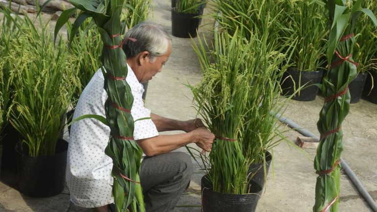 Từ những hạt lúa vốn gắn liền với ruộng đồng, bữa cơm gia đình, ông Phương đã tạo nên những chậu kiểng mang đậm hồn quê, góp thêm sắc xuân cho nhiều ngôi nhà mỗi độ Tết đến. Khác với lúa trồng ngoài đồng nhằm phục vụ sản xuất lương thực, lúa kiểng được ông Phương chăm sóc như một loại hoa kiểng thực thụ. Cây phải sinh trưởng đồng đều, bông trổ đúng thời điểm, hạt chắc và chín vàng rực rỡ vào những ngày giáp Tết. Công việc đòi hỏi sự tỉ mỉ, chính xác và cả niềm đam mê lớn với nghề.