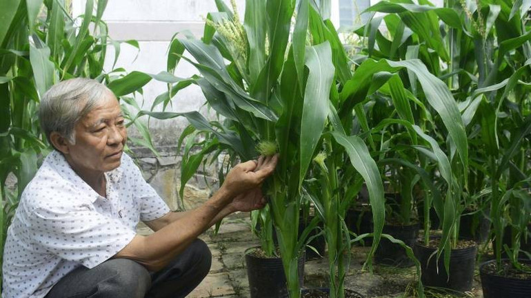 Ba năm gần đây, ông tiếp tục thử nghiệm làm kiểng bắp (ngô) lùn. Từ hình ảnh trái bắp chắc hạt, đầy đặn gợi liên tưởng đến sự no đủ và thuận lợi. Hiện ông trồng khoảng 80 chậu bắp nếp, mỗi cây cho trung bình hai quả, được xử lý thấp để phù hợp làm kiểng.
